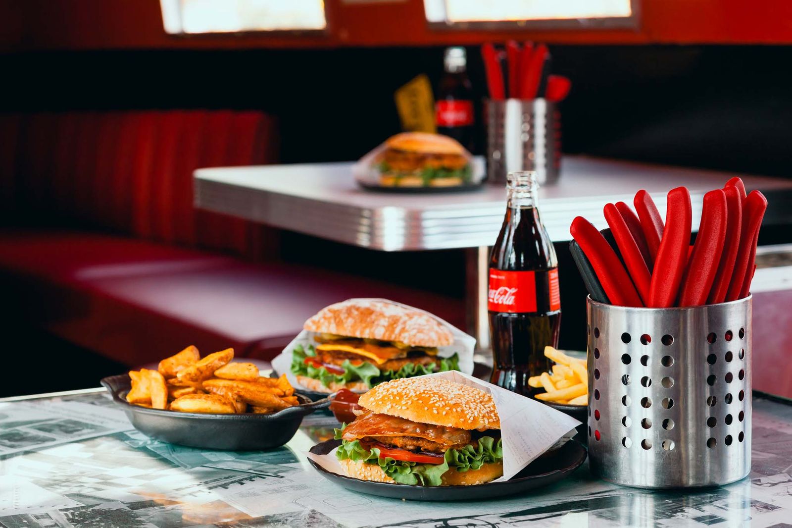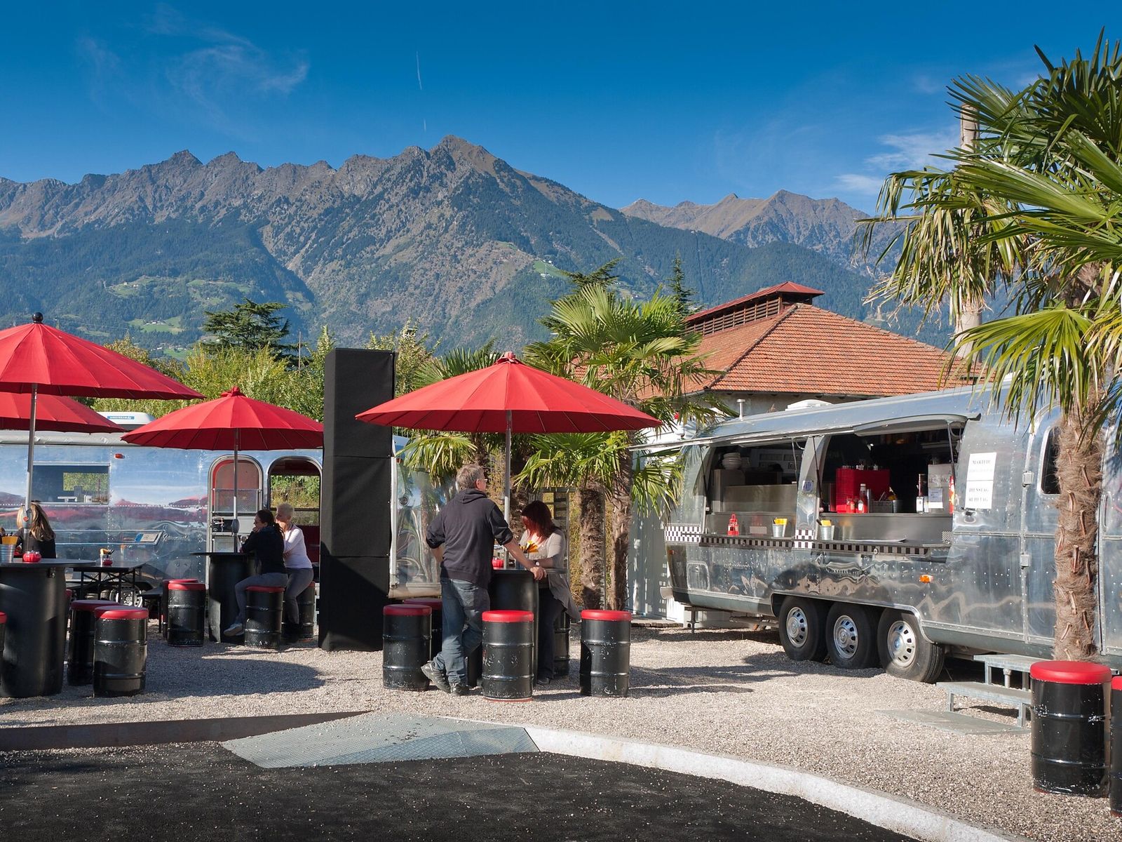 A burger restaurant in American motorhomes between palm trees and cypresses – a unique place to enjoy yourself. The silver Airstreamers are eye-catching, and the burgers and other dishes are a treat for the taste buds. Lounges, parasols, parking and a playground round off the experience.